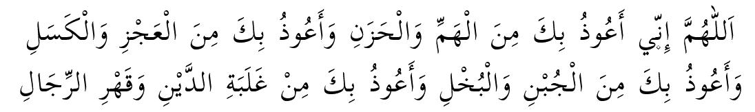 “Allahümme innî e’ûzü bike mine’l-hemmi ve’l-hazeni. Ve e’ûzü bike mine’l-‘aczi vel-keseli. Ve e’ûzü bike minel cübni vel-buhli. Ve e’ûzü bike min ğalebetid-deyni ve kahrir-ricâli.”