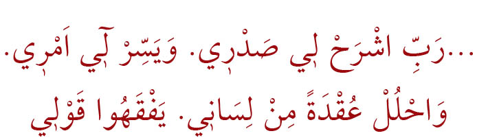 Anlamı: “…Rabbim! Gönlüme ferahlık ver. İşimi bana kolaylaştır. Dilimdeki tutukluğu çöz. Ki sözümü anlasınlar.” (Taha Suresi 25-28)