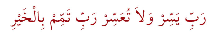 Anlamı: “Rabbim! İşlerimi kolaylaştır, zorlaştırma, Rabbim işlerimi hayırla sonuçlandır. Amin!”