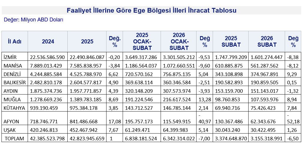 Ticaret Bakanlığı, şubat ayı faaliyet illeri ihracat istatistiklerine göre Ege Bölgesi’nin ihracatı 2026 yılının iki aylık döneminde 496 milyon dolar geriledi. Ege Bölgesi, 2025 yılının ocak- şubat döneminde 6,8 milyar dolar ihracat yapmışken 2026 yılının aynı döneminde 6,3 milyar dolar ihracat yapabildi.