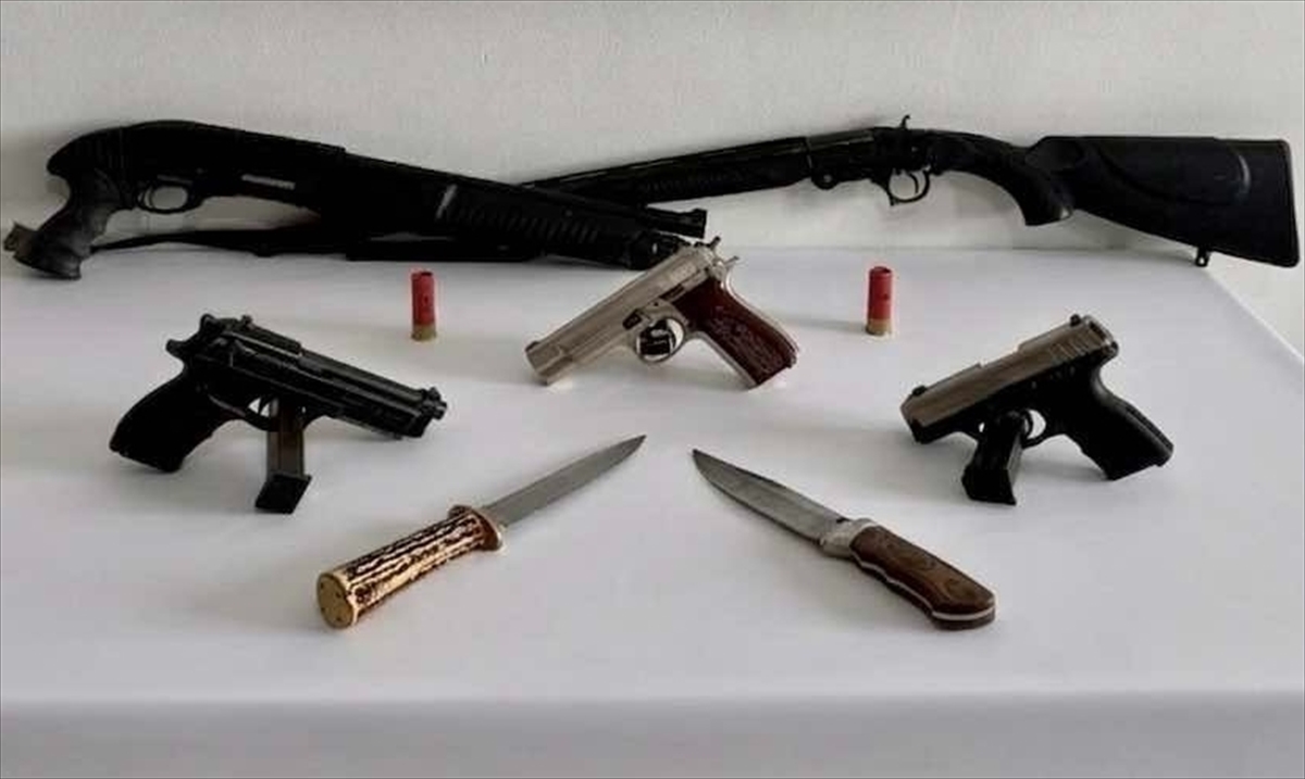 Zanlıların ikametlerinde yapılan aramalarda, 2 ruhsatsız tabanca, ruhsatsız pompalı tüfek, ruhsatsız av tüfeği, 2 kama bıçak ve 2 adet 12 kalibre fişek ele geçirildi.
