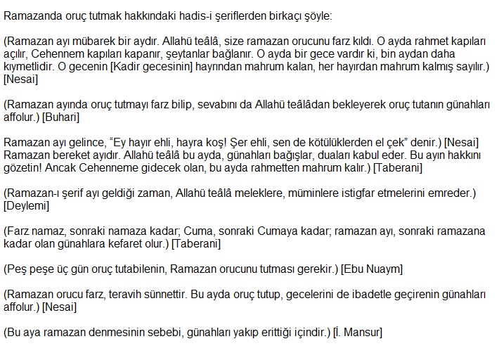 Kur’an-ı kerim, Ramazan ayında indi. Kadir gecesi, Ramazan ayının içindedir. Ramazan ayında, orucu erken açmak, sahuru imsak girene kadar geç yapmak sünnettir. Hz. Peygamberimiz bu iki sünneti yapmaya çok fazla önem verirdi.