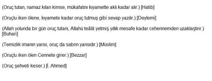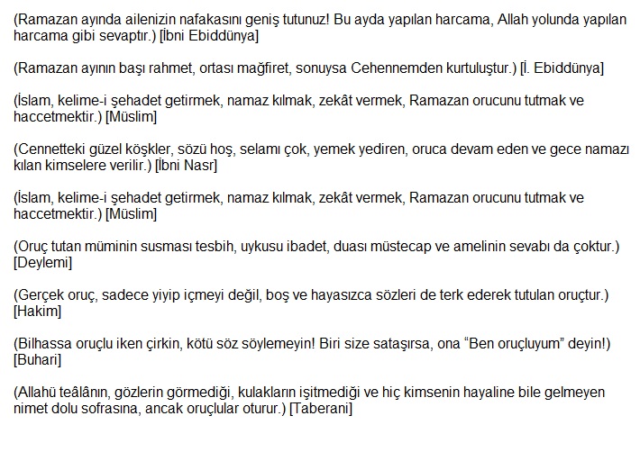 Bu Ramazan ayında yapılan bir farz ibadeti, diğer 11 aylarda yapılan yetmiş farz ibadeti gibidir. Ramazan ayında bir oruçluya iftar yemeği veren kişinin günahları affolur. Cehennem azabından azat olur.