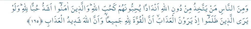 Vemine-nnâsi men yetteḣiżu min dûni(A)llâhi endâden yuhibbûnehum kehubbi(A)llâh(i) velleżîne âmenû eşeddu hubben li(A)llâh(i) velev yera-lleżîne zalemû iż yeravne-l’ażâbe enne-lkuvvete li(A)llâhi cemî’an veenna(A)llâhe şedîdu-l’ażâb(i)